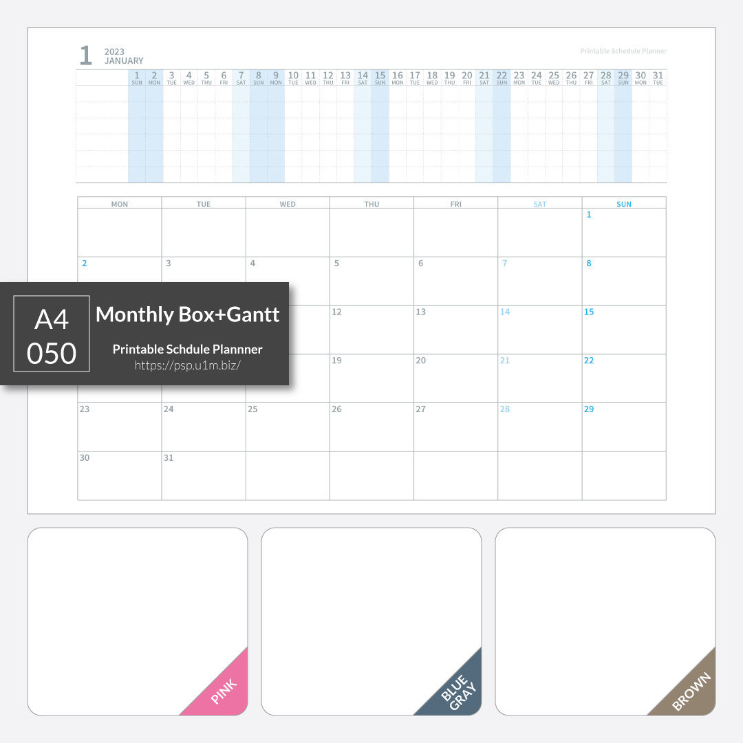 【pdf de calendar】A4_050_月間ガントチャート+ボックス[A4,MG+MB,Mon]