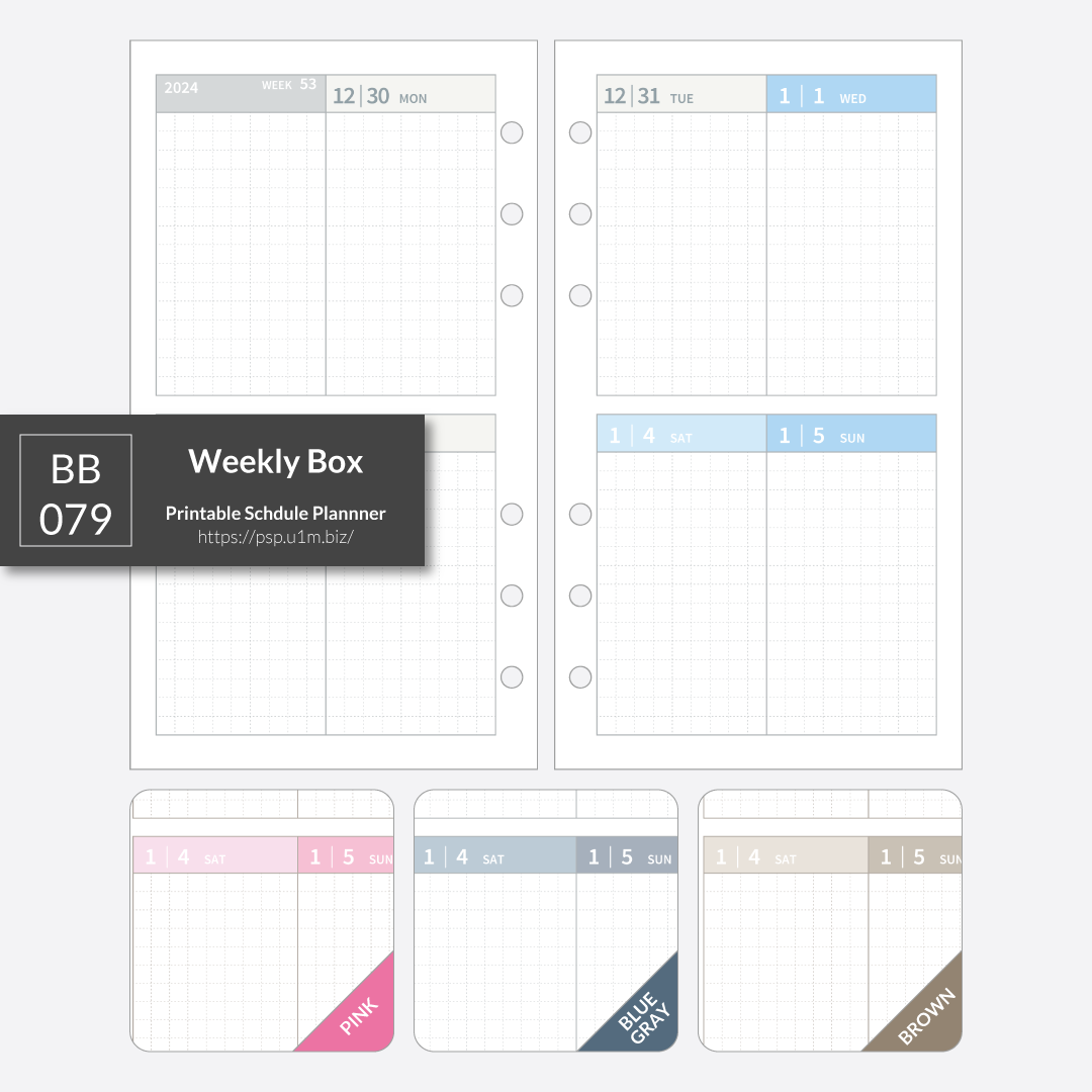 BBの週間ボックス型リフィル。月曜はじまりに最適化した紙面で、予定の“箱”を先に作ってからメモで肉付けする運用がしやすく、ざっくり→具体化の流れを1枚で完結できます。 ボックスで予定を俯瞰しやすく、メモやToDoの整理にも向きます。