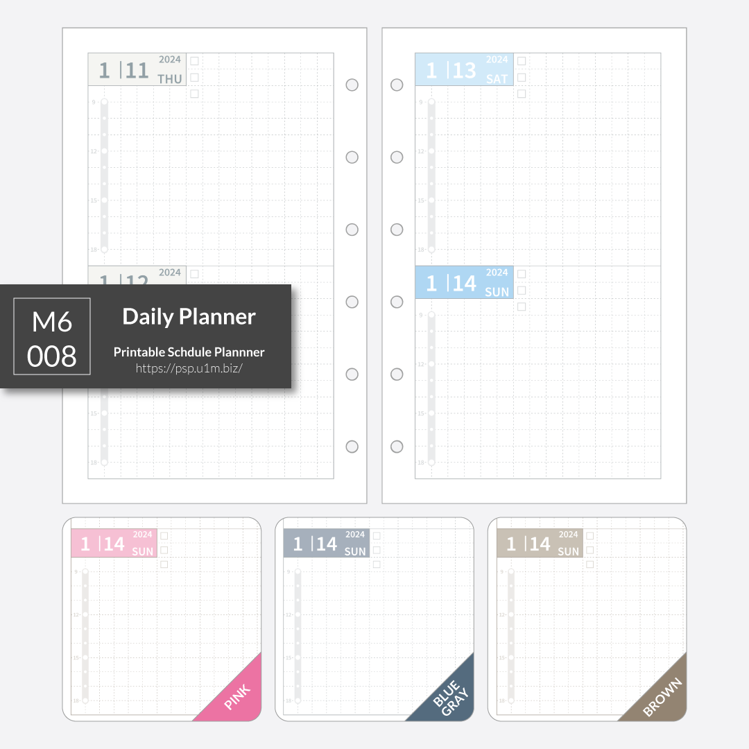 M6のサイズのディリー。1ページに上下で2日分、見開きで4日分レイアウトしてあります。9-18時の時間軸をレイアウトしてあります。