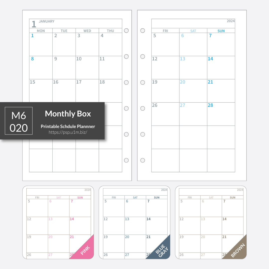 【pdf de calendar】M6_020_月間ボックス(fri-sun広め)[M6,LR,M/B,Mon]