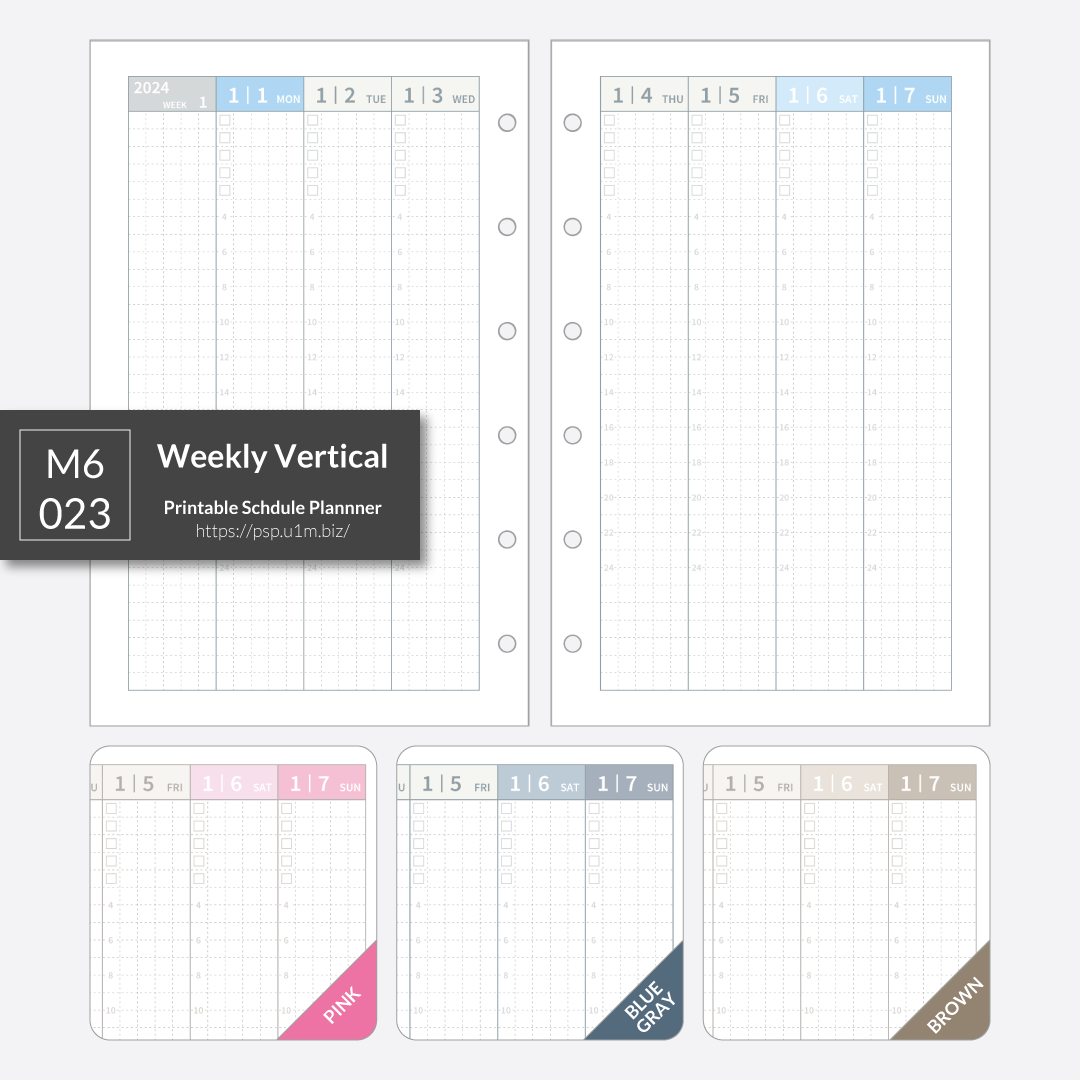 M6サイズの週間バーティカル。月曜はじまりに最適化したレイアウトで、1週間のリズムを保ちながら、日々の優先度と負荷を無理なく配分できます。会議や移動が重なる日も、時間帯の山谷が把握しやすく、余白時間の活用が進みます。 時間帯ごとの流れを見える化し、タイムブロッキングの精度を高めます。