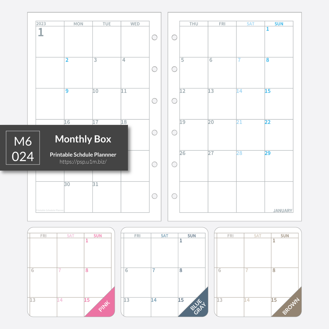 M6の月間ブロック。予定や締切、ルーティンを一望できる定番フォーマットです。プロジェクトの里程表づくりや、家族・サークルの予定共有にも向きます。 ボックスで予定を俯瞰しやすく、メモやToDoの整理にも向きます。
