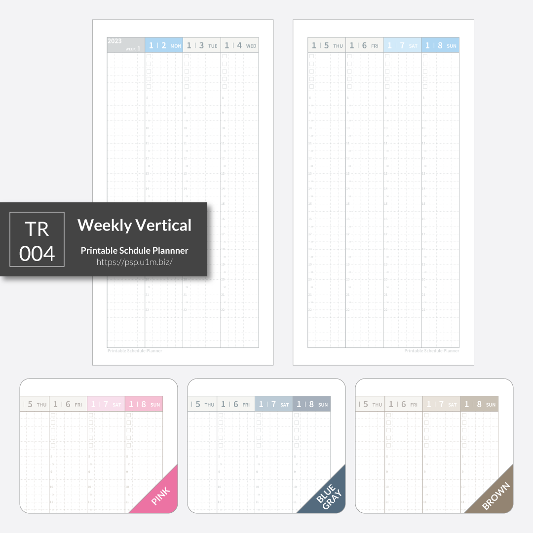TRサイズの週間バーティカル。月曜はじまりに最適化したレイアウトで、1週間のリズムを保ちながら、日々の優先度と負荷を無理なく配分できます。会議や移動が重なる日も、時間帯の山谷が把握しやすく、余白時間の活用が進みます。 時間帯ごとの流れを見える化し、タイムブロッキングの精度を高めます。